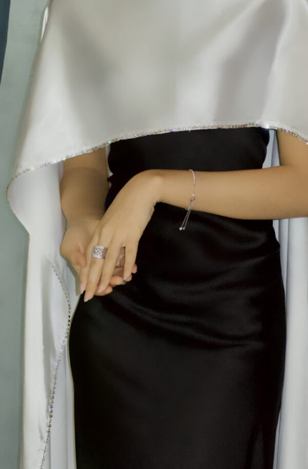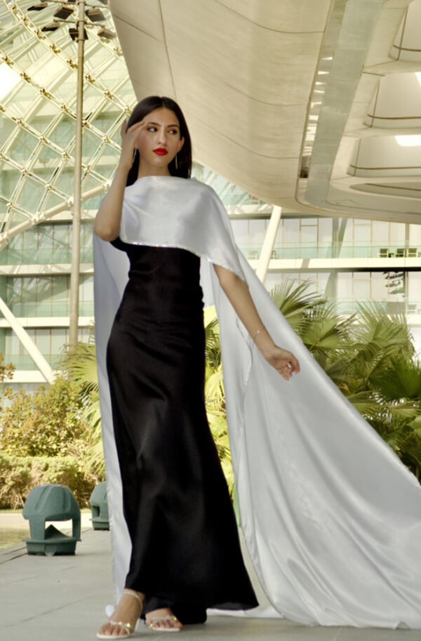 This exquisite two-piece gown is a perfect blend of elegance and sophistication. Featuring a sleek black silk dress with a flowing white cape, it’s designed to make a lasting impression at any formal event.