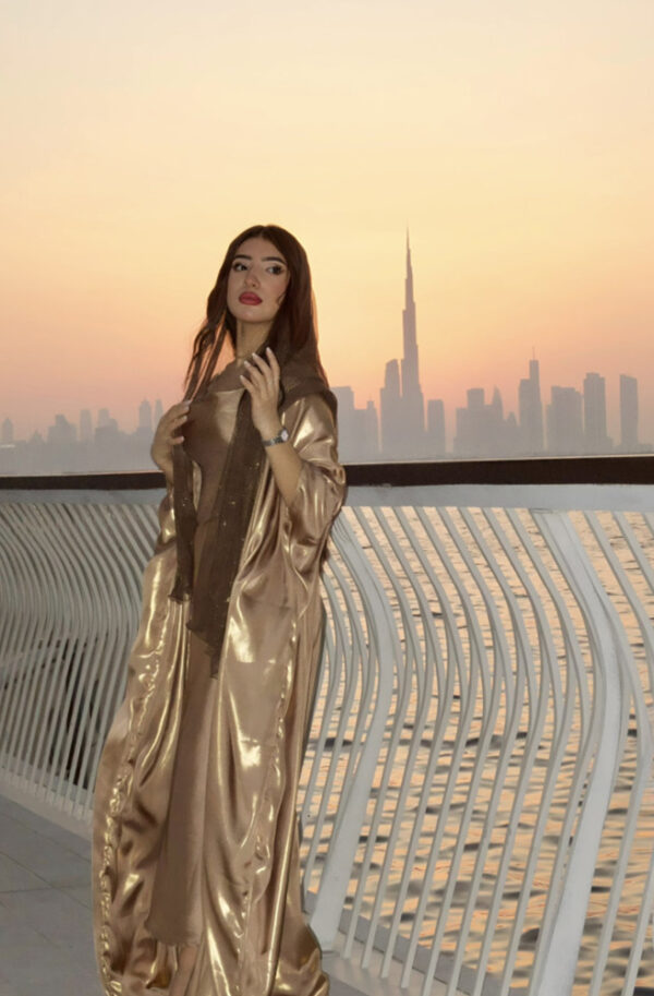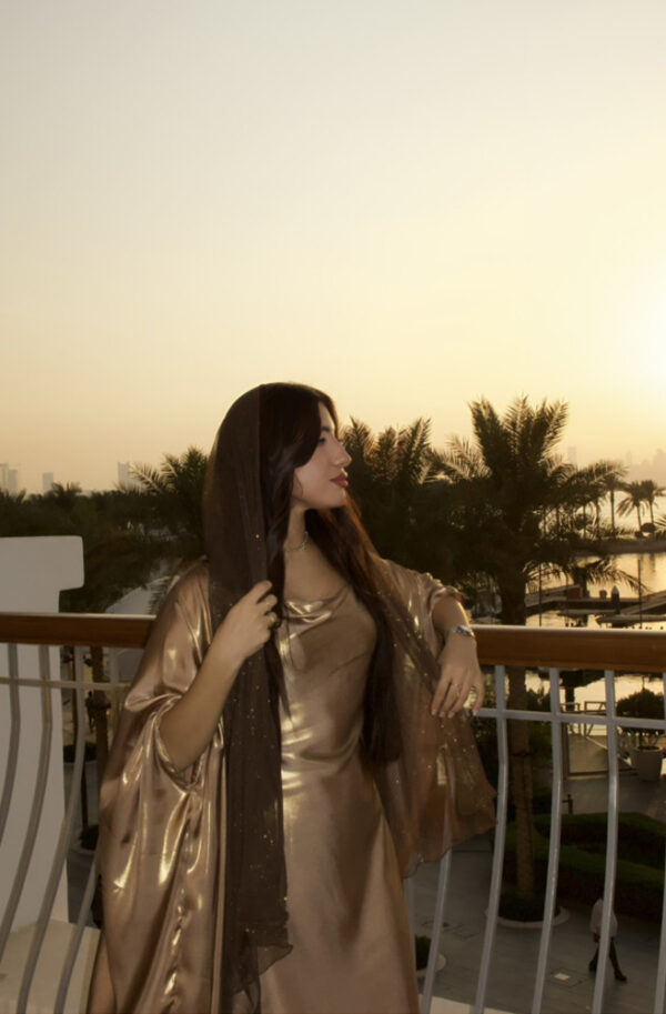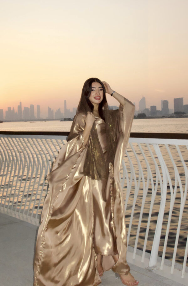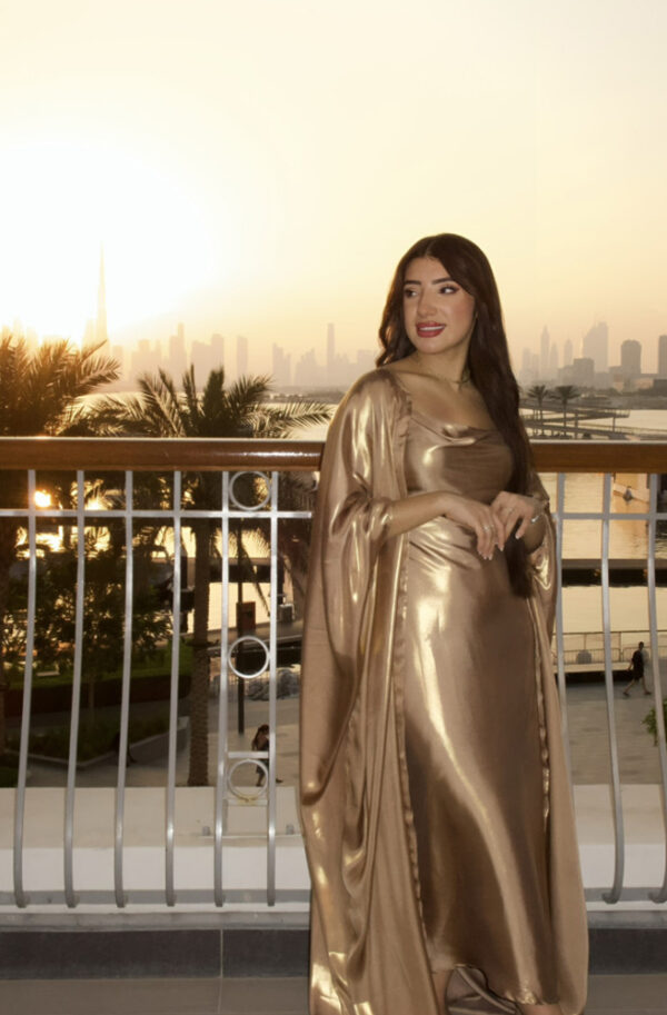 Step into elegance with this breathtaking two-piece golden ensemble, designed to make you shine at any special occasion. This set features a stunning sleeveless gown crafted from luxurious silky fabric, offering a flawless fit that enhances your silhouette. The look is completed with a flowing cape-style outer layer, adding a touch of regal sophistication. The metallic sheen and draped design ensure you stand out effortlessly, making it perfect for galas, weddings, and evening soirées.