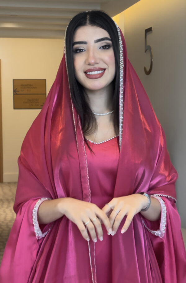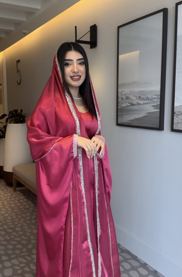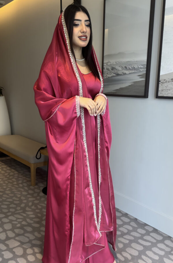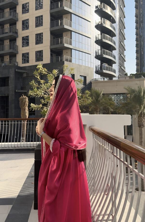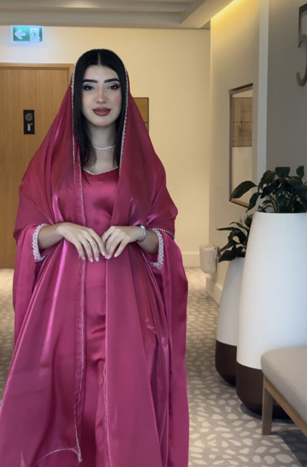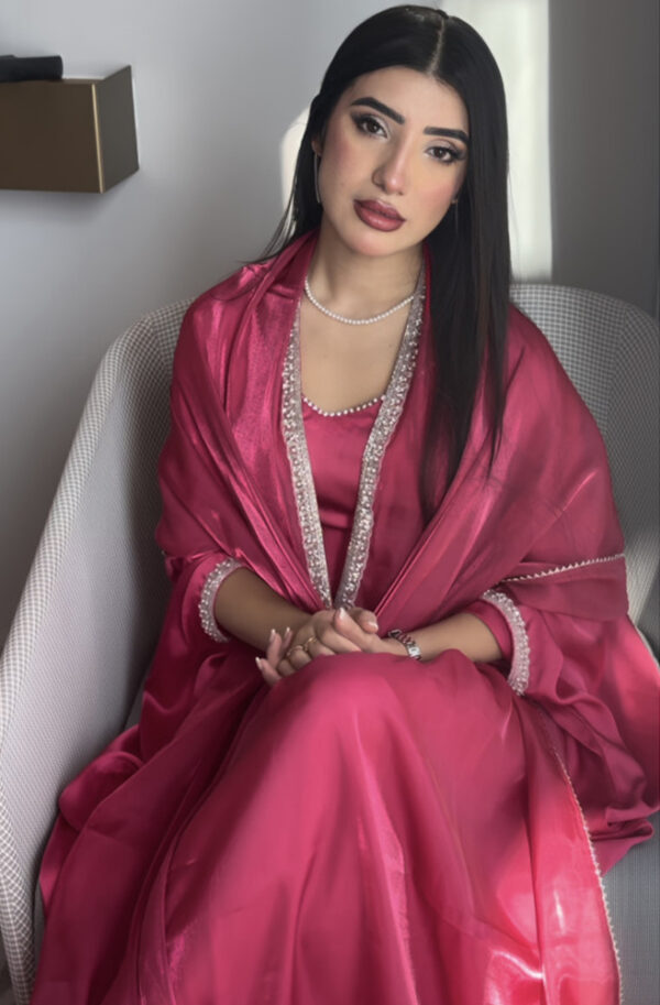 Radiate grace and elegance with this stunning pink satin gown, complete with a matching dupatta adorned with a delicate beaded trim. This eye-catching ensemble is perfect for special occasions, combining luxurious fabric with a flattering silhouette.